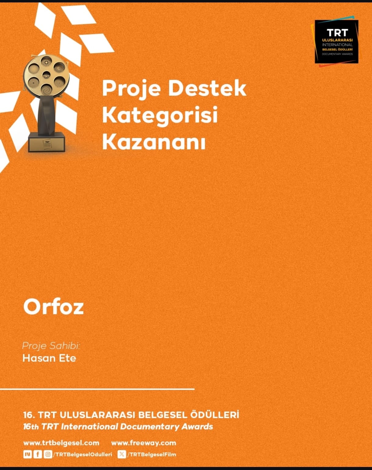 Aynı bölümün 2019 mezunlarından Hasan Ete ise “Orfoz” adlı çalışmasıyla Proje Destek Kategorisi ödülünü kazandı. Ete’nin belgesel projesi, çevre duyarlılığı temasıyla öne çıkarak dikkat çekti.