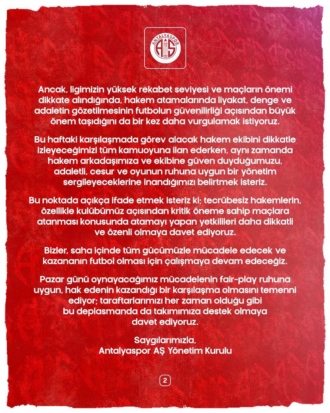 Antalyaspor yönetimi, Türk futbolunun adalet, emek ve saygı temelleri üzerinde yükselmesi gerektiğini vurgulayarak, Türkiye Futbol Federasyonu tarafından yapılan hakem atamalarının kamuoyu tarafından yakından takip edildiğini hatırlattı. Ligin geride kalan 8 haftasında takımın 4 maçına tecrübesiz hakemlerin atandığını belirten açıklamada, Çaykur Rizespor karşılaşmasında da benzer bir durumun yaşandığı ifade edildi.