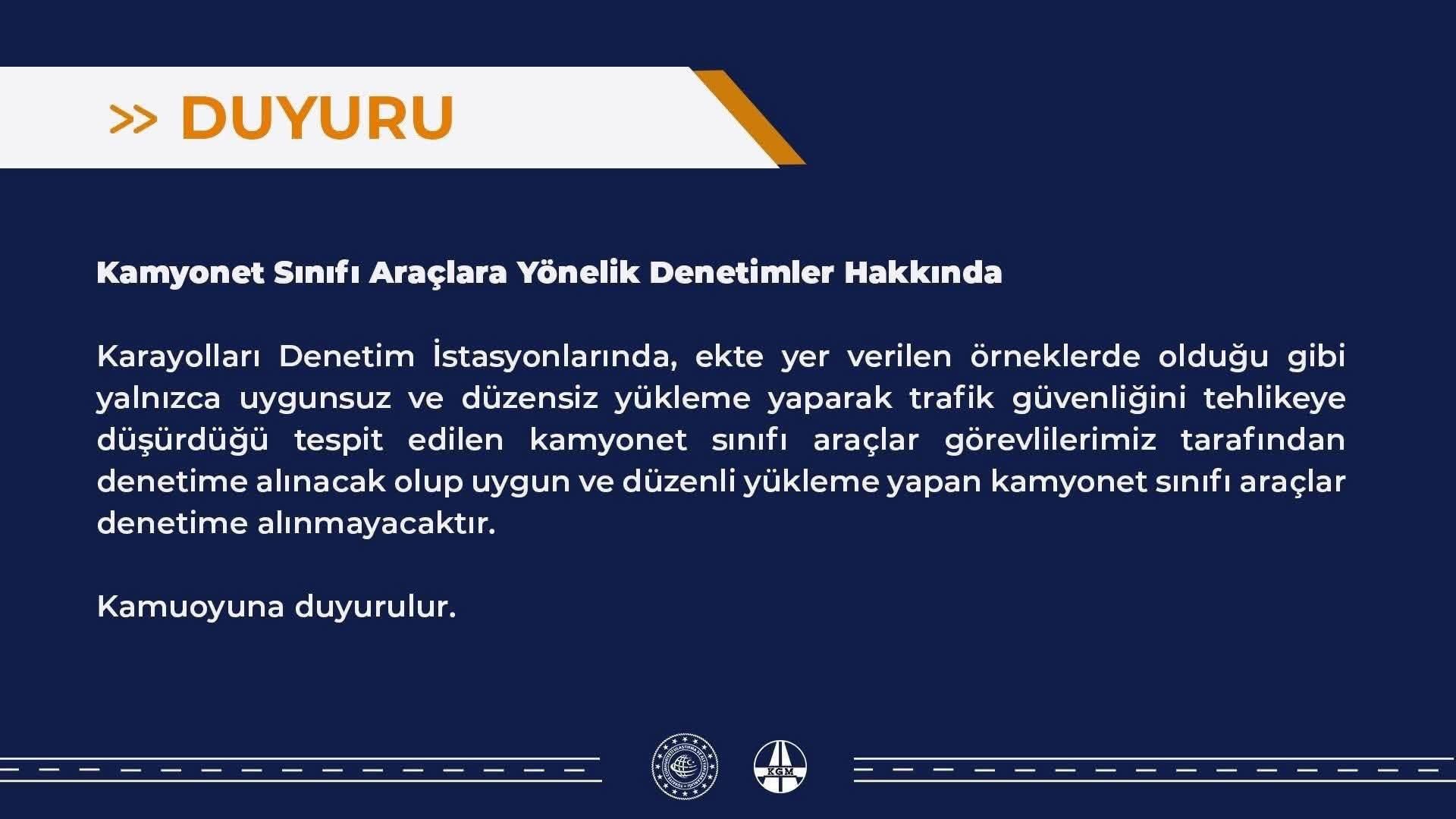 KGM’nin duyurusuna göre, karayolu denetim istasyonlarında yapılacak kontrollerde düzensiz yükleme nedeniyle trafik güvenliğini tehlikeye düşüren kamyonet sınıfı araçlar durdurulacak. Ancak yüklemesi düzenli ve güvenli olan araçlar denetim dışı bırakılacak.