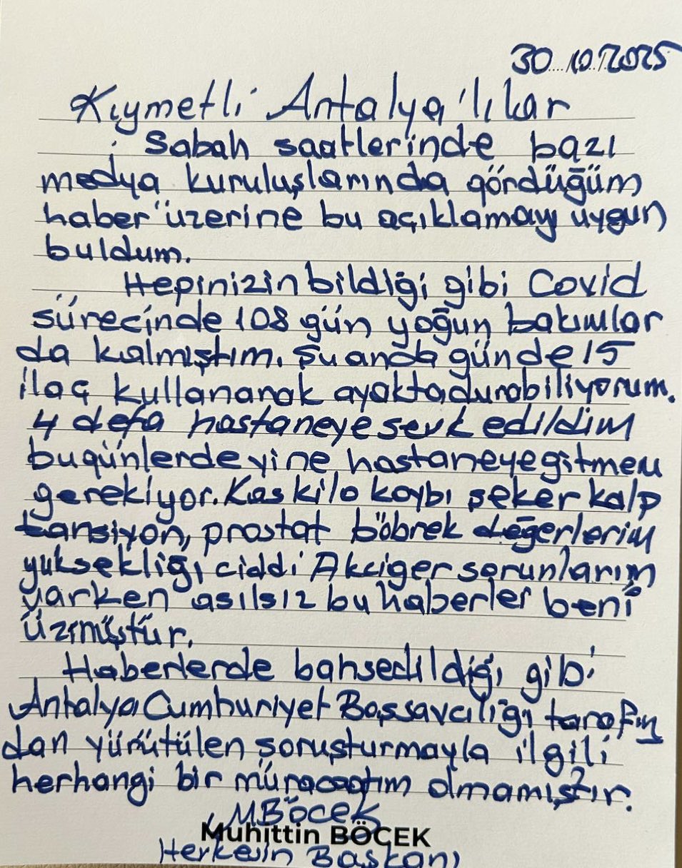 Böcek, mektubunda sabah saatlerinde bazı medya kuruluşlarında yer alan haberlerin doğru olmadığını ifade ederek, “Antalya Cumhuriyet Başsavcılığı tarafından yürütülen soruşturmayla ilgili herhangi bir münasebetim olmamıştır” dedi.